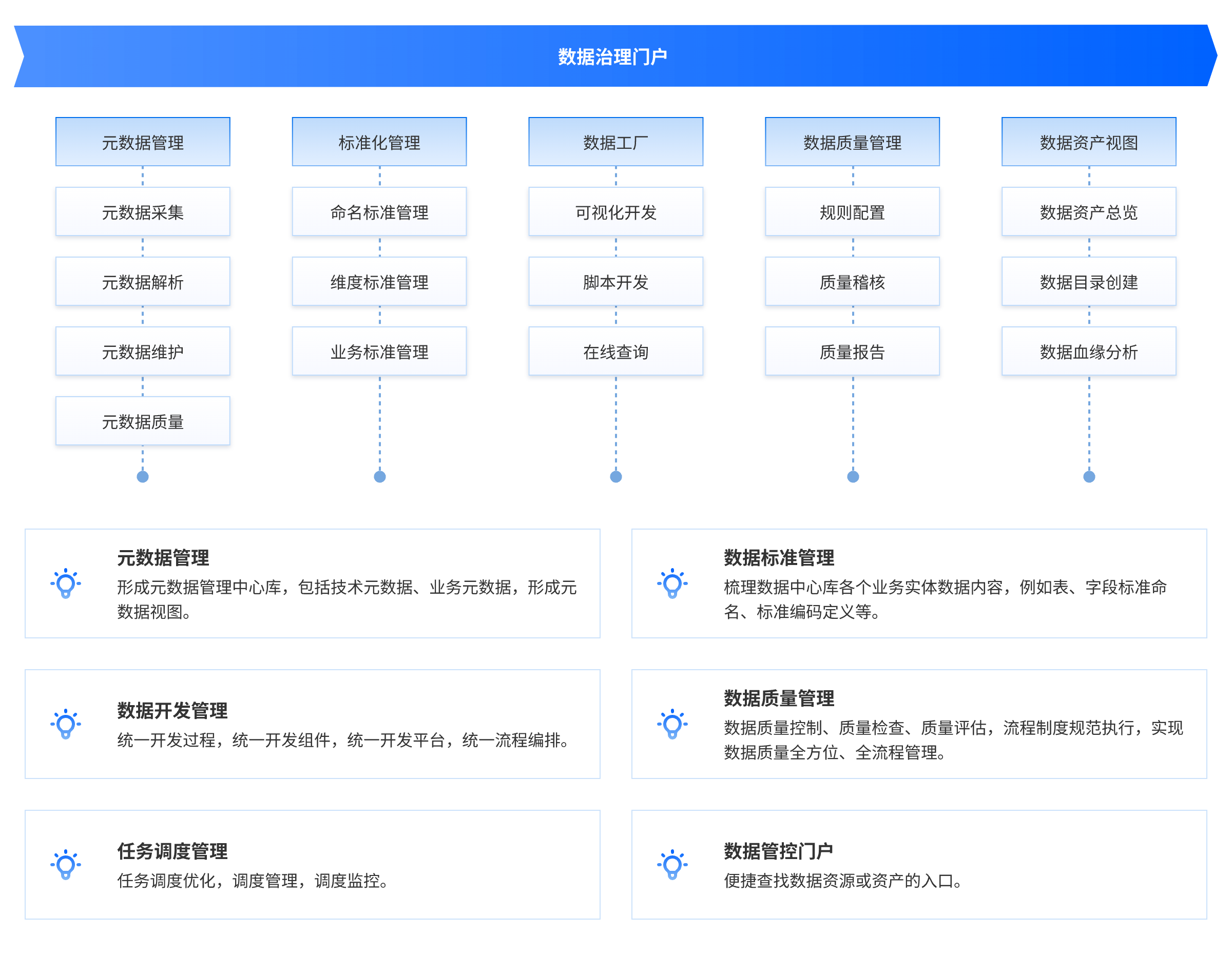 達普信數據治理平臺以數據為核心貫穿數據全生命周期的管理。通過對異構數據環境的綜合管理,構建標準化、流程化、一體化的數據管理體系: