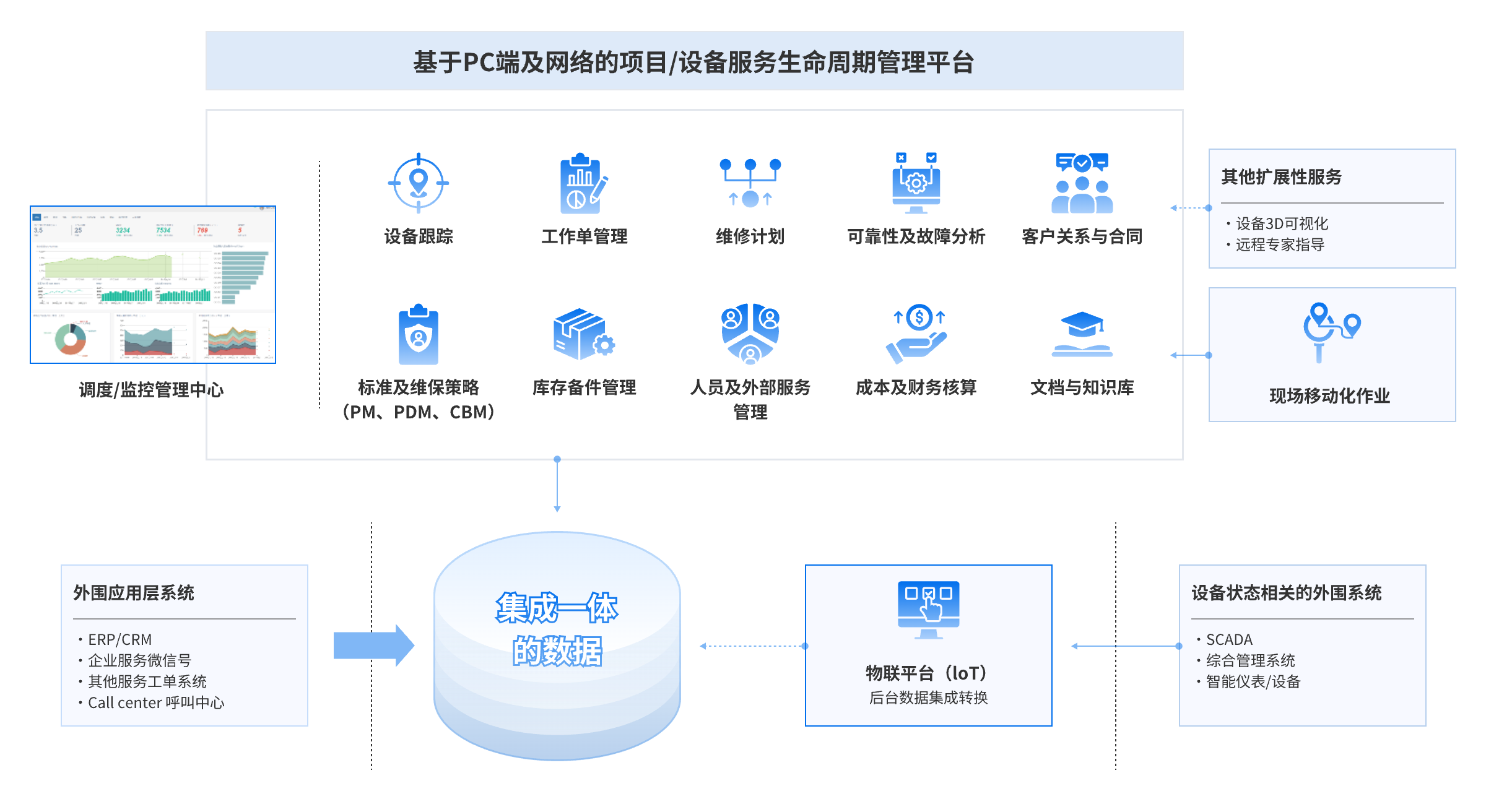 構建一體化平臺:以客戶售后服務為核心,實現完整的售后服務活動閉環,構建支持報修、響應、派工、退換貨、結算等主營業務的數字化管理平臺